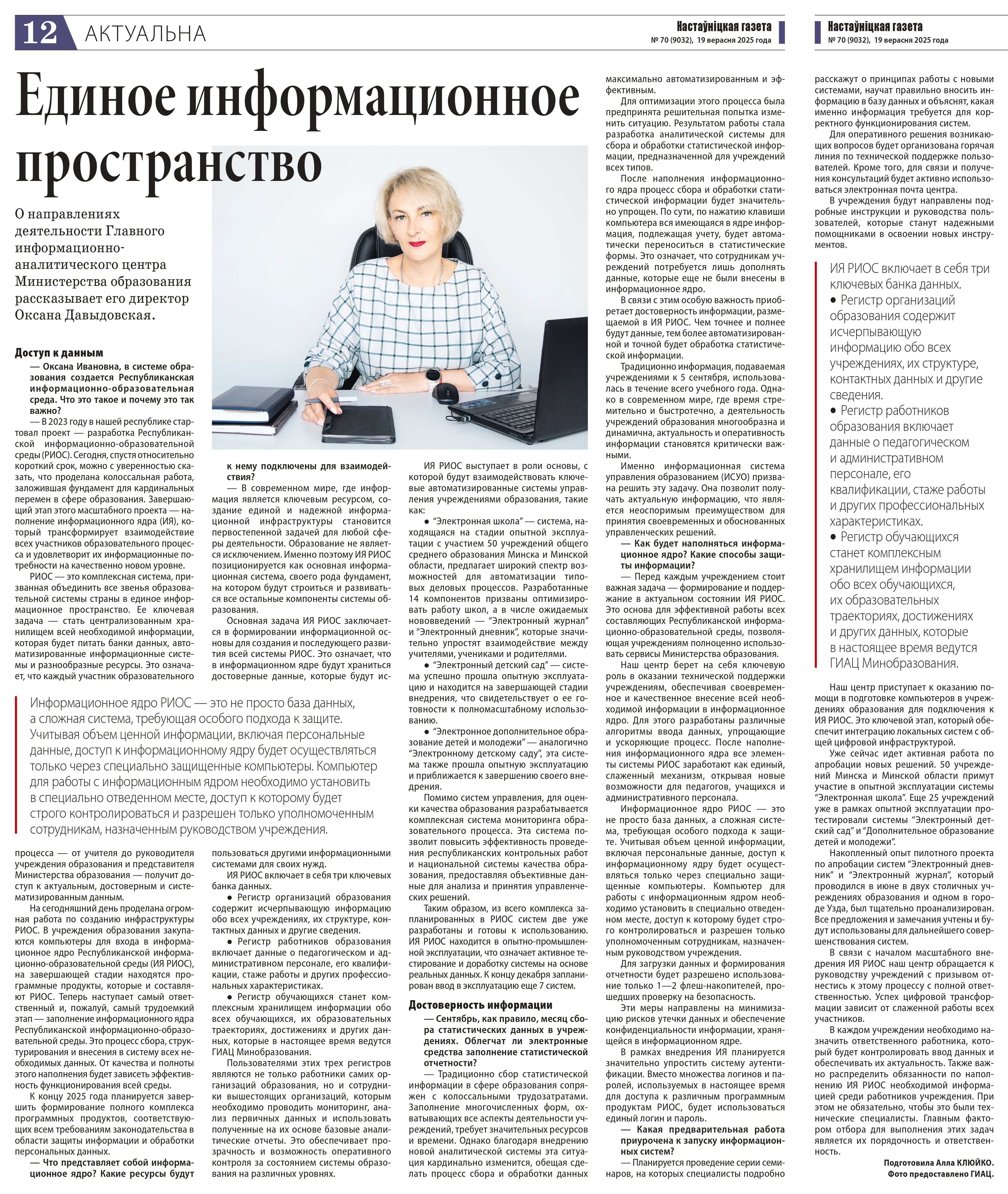 «О направлениях деятельности Главного информационно аналитического центра Министерства образования рассказывает его директор Оксана Давыдовская» © редакция газеты «Настаўніцкая газета»